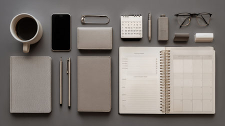 A stylish flat lay showcasing a minimalist workspace featuring a cup of coffee, modern notebook, smartphone, and essential stationery items, ideal for planning and productivity.