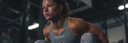 Close Up Portrait of a Beautiful Strong Fit Brunette Looking at the Camera in a Loft Industrial Gym with Motivational Posters. Shes Catching Her Breath after Intense Fitness Training Workout.