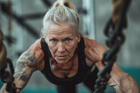High angle view of a sporty determinate middle aged African American, mixed race woman doing arm exercises with suspension straps while performing an outdoor cross training in the sports field