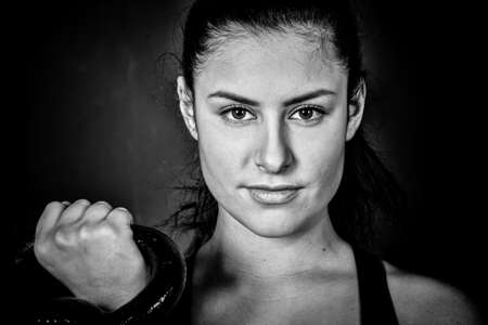 Woman holding a kettlebell and looking to camera - crossfit fitness