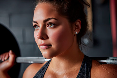 Plus-size woman lifting weights in a gym, sweat visible, realistic lighting, motivational vibe