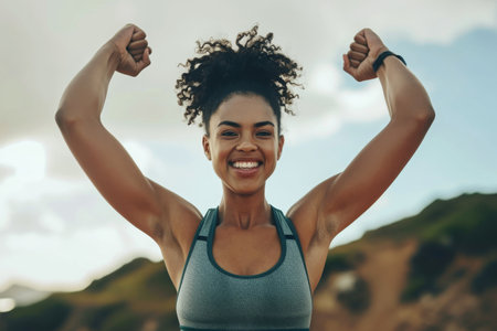 A strong woman showcases her muscular physique as she flexes her arm in front of a majestic mountain, A person achieving their fitness goal, filled with triumphant emotion, AI Generated