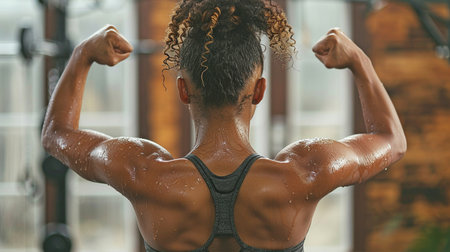 close-up of a woman's back as she flexes her muscles after working out and her skin is perspiring.