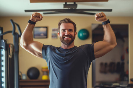 Muscular sportsman is flexing his biceps and smiling, celebrating his fitness progress in a home gym