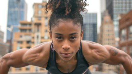 A portrait of a powerful Black female Olympic weightlifter, wearing sleek sports gear, against a vibrant, colorful background. She is preparing for a lift, with a determined look on her face.