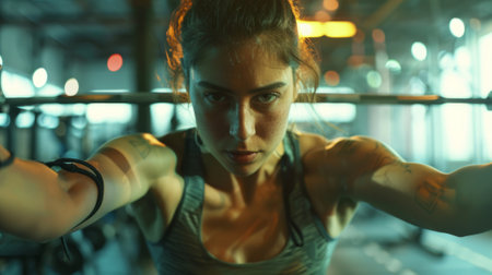 A striking close-up of a muscular woman flexing her bicep, her powerful and athletic physique illuminated by dramatic lighting, set against a minimalist dark background for bold impact, banner