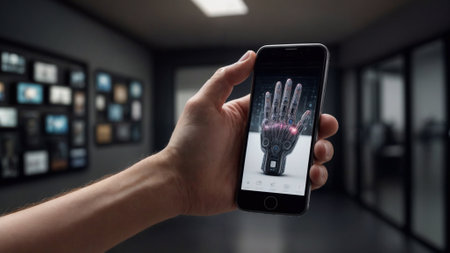 A person's hand holding a phone displaying an image of a robotic hand.