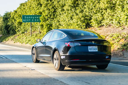 May 22, 2020 Sunnyvale / CA / USA - Tesla Model 3 driving on the freeway in Silicon Valley