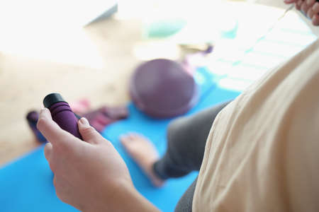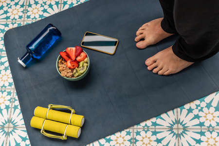 Unrecognizable person next to dumbbells, smartphone, water and bowl of cereals and fruits on mat