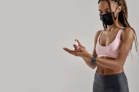 Young sportive mixed race woman in medical mask using hand sanitizer while standing isolated over grey background. Health, sports, quarantine concept