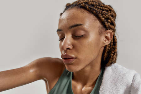 Close up portrait of young sportive mixed race woman looking aside, resting after training isolated over grey background. Healthy lifestyle and sports concept