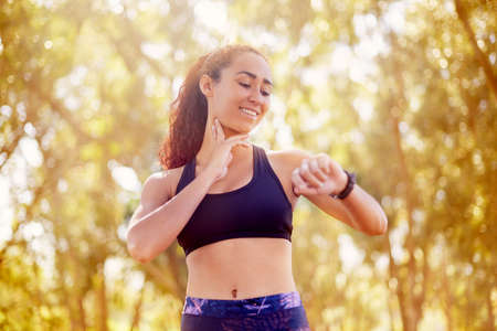 Young sportswomen drinking fresh water and reading text messages from friends on smartphone and checking time