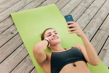 Young cheerful sport woman in sportswear listens to music and holds smartphone in his hands while lying on mat at wooden terrace outdoor