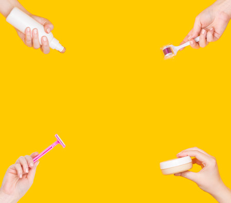 Shaving machine, dermaroller and cream in the corners in a woman's hand. Yellow background, free space for text.