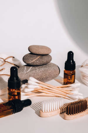 Zero waste care and hygiene concept. Various items for eco home. Wooden plate,toothbrushes, face brush, comb, aroma oil in an amber bottle, soap, cotton pads on wood white table. Top view.
