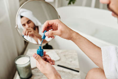 Close-up of young man opening blue varnish and painting his nails after bath procedure