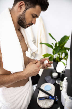 man squeezing a jar of exfoliating and putting the required amount on his fingers. a skin care routine