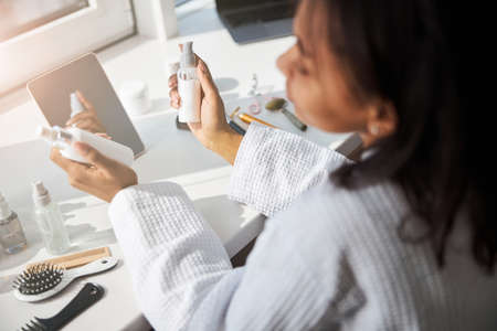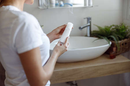 Rear of Caucasian woman holding cream or beauty product in bathroom. Over shoulder.