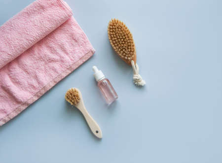 Zero waste of bathroom accessories, natural brush, wooden comb, oil, makeup remover in a glass container. lifestyle concept, flat lay.