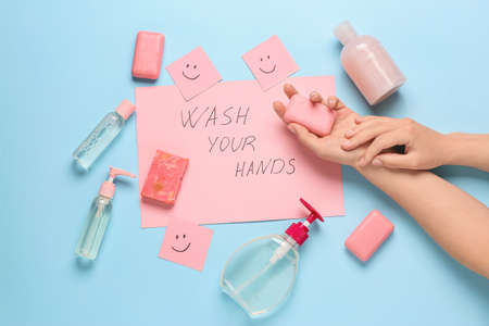 Female hands holding soap and paper with text WASH YOUR HANDS on color background