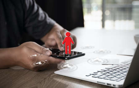 Close up of man hand using smart phone and laptop computer in modern office.