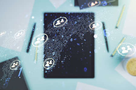 Double exposure of social network icons concept with world map and digital tablet on background, top view. Marketing and promotion concept