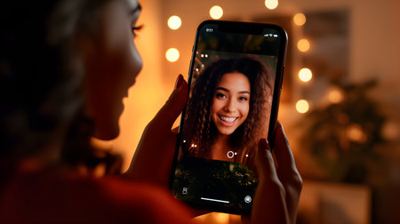 Young teen girl relax sitting at home and holding phone video calling distance friend dating online on mobile screen using smartphone video chat app. Over shoulder close up view
