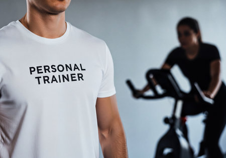 Close-up on a man's torso wearing a white t-shirt with PERSONAL TRAINER text, overseeing a blurred woman on an exercise bike in a gym.
