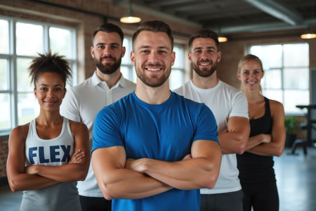 A group of five fit individuals standing together with arms crossed, smiling in a bright gym setting.