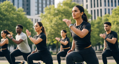 Five individuals performing lunges outdoors in a park, wearing athletic clothing, with city skyline and trees in the background.