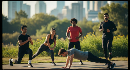 A diverse group of five individuals exercising in an urban park during sunset, with city skyline in the background.