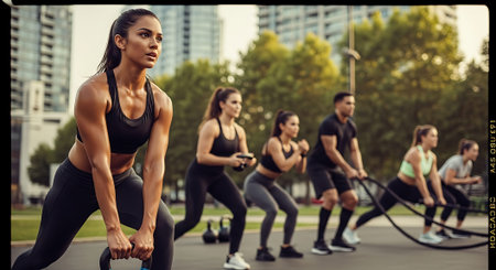 A diverse group exercising outdoors in a city park, using battle ropes and kettlebells, with a focus on strength and cardio training.
