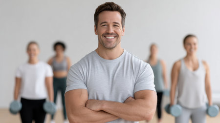 A confident male fitness instructor stands in front of his workout class, showcasing enthusiasm and energy. Participants engage in strength training, emphasizing community and motivation.