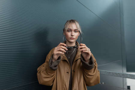 Pretty young stylish woman in a fashion brown oversize jacket with a sweater puts on sunglasses near a metal wall outdoors