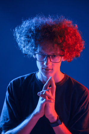 Red and blue colors. Young man with curly hair is indoors illuminated by neon lighting.