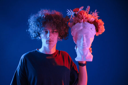 Holding ceramic head of woman. Young man with curly hair is indoors illuminated by neon lighting.