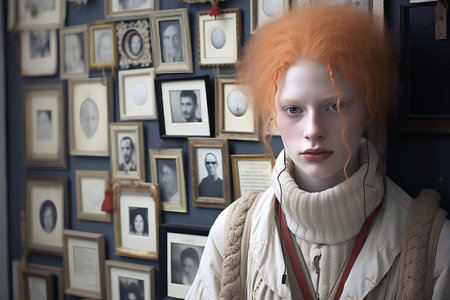 A portrait of a woman artist with white skin and orange hair, standing against the wall with framed photographs.