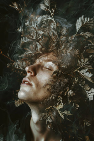 A serene portrait of a male model surrounded by textured dark foliage, representing the theme of connection with nature and inner peace, evoking emotions of calmness and tranquility