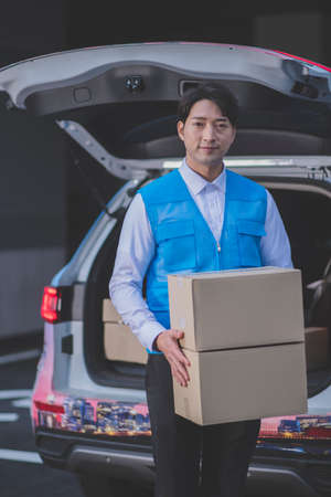 Smiling cheerful thai delivery man on blue working custume carrying cardboard boxes.