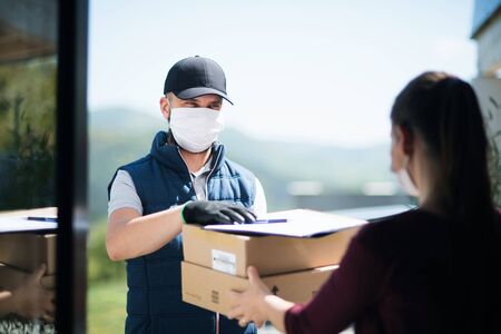 Courier with face mask delivering parcel, corona virus and quarantine concept.