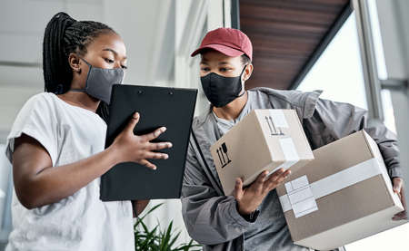 African male postal delivery courier man holding delivering package boxs and cardboard