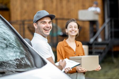 Portrait of a happy client with a male courier delivering goods by vehicle to a woman home, workman moving parcels on the background