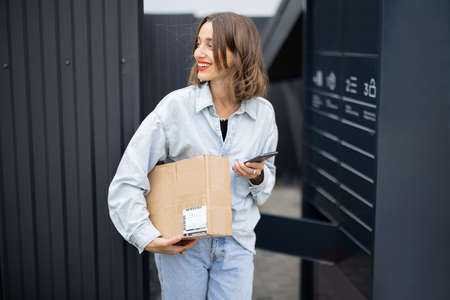 Young caucasian woman with parcel near automatic post terminal. Smiling girl holding smartphone and looking away on city street. Concept of smart delivery. Idea of modern shipping and logistics