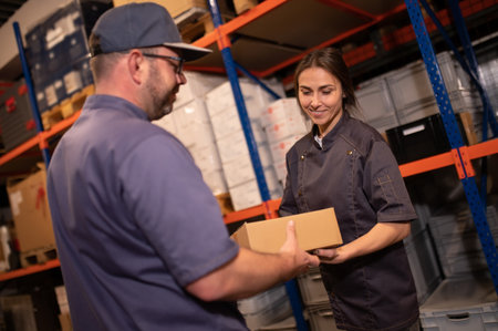 Woman receives a parcel from a postman. Postman is sending a parcel to a woman.