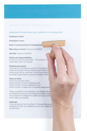 female hand puts a stamp in the employment contract