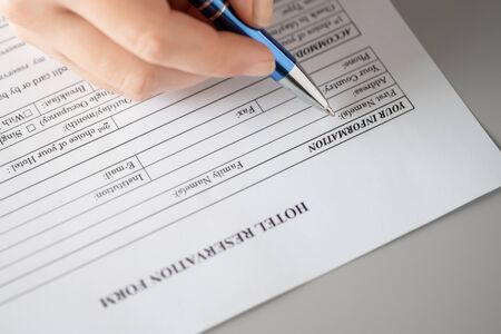 Woman customer filling property reservation form, personal information, address, phone number, email, nationality on the table at the office. Close up. Selective focus.