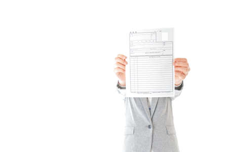 Business woman holding a paper with a checklist isolated on white background.