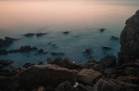 Sea gravel shore or beach with soap bubbles at sunset , tinted photo.