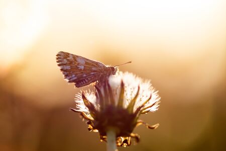 Beautiful tender delicate butterfly on white fluffy dandelion.