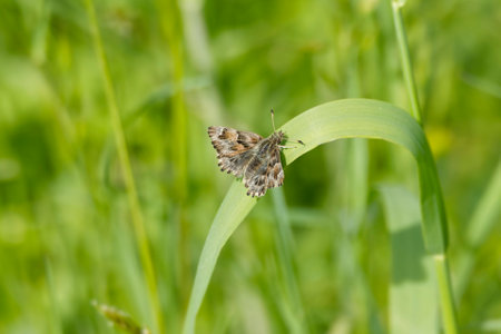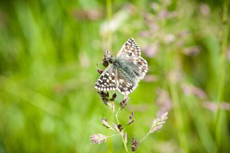 Mallow skipper (Carcharodus alceae) butterfly perched on grass blade in Zurich, Switzerland